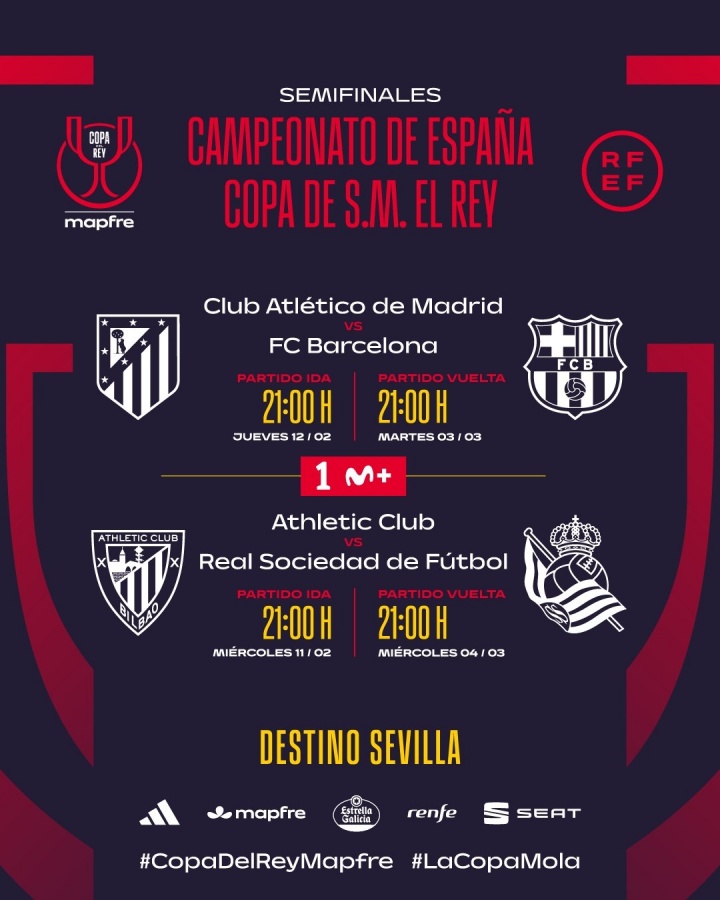 02月06日讯 国王杯半决赛对阵抽签今天进行,最终巴萨遭遇马竞,毕巴将对阵皇社。